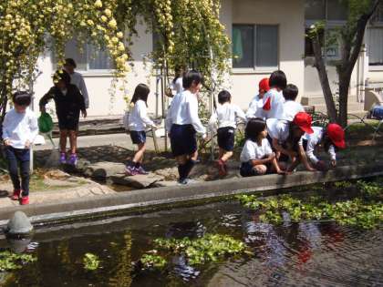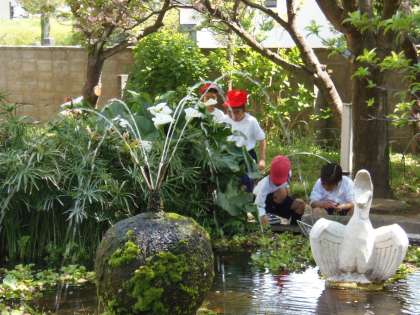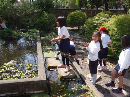 4月13日(金)中休みになるとウォーターランドに子どもたちが集まってきます。コイと一緒に遊んだり、水辺の生物を探したりとにぎやかな声が聞こえてきます。毎年この時期には「池ポチャ」の子が多くなりますので、時には着替えが必要かも知れませんね。