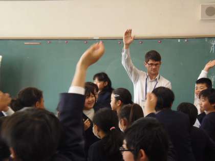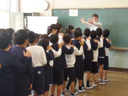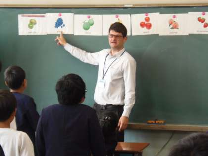 4月20日(金)1校時目、5年生の教室では、今年度ALTのマシュー・ベーカー先生による外国語活動の授業が行われていました。果物やスポーツの単語の発音練習をした後、楽しく体を動かしながら「I like 〜」の言い方について学習していました。英語に親しみながら生き生きと活動する子どもたちの表情が印象的でした。