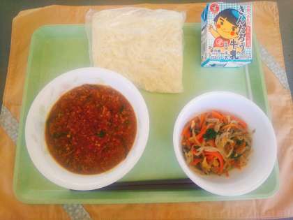 9月28日(金) 公開日 2018/09/28 更新日 2018/09/28 今日の給食 今日の献立は、ジャージャー麺、牛乳、もやしのナムルです。もやしのナムルは、シンプルな料理ですが、食べやすく大人にも子どもにも好評でした。給食では必ず火を通さなくてはならないので、ナムルといっても大きな回転釜で炒めて作っています。今日のナムルは、にんにく、人参、もやし、こまつな、ベーコンをごま油、しょうゆ、塩、さとうで味付けしています。あっさりとしていますが、野菜をたくさん食べたいときにおすすめです。 いいね(0)