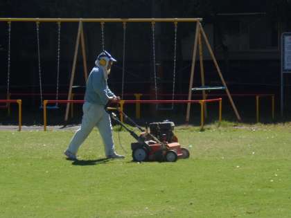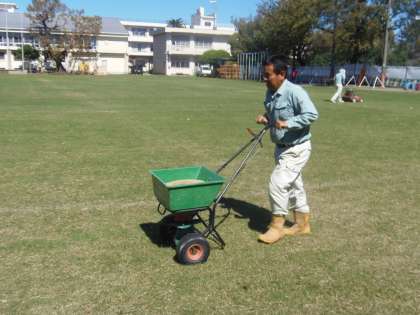 10月1日(月)日頃から新玉小学校の芝生管理でお世話になっている加藤さんが来校し、冬芝の種を蒔いてくださいました。最初に種が定着しやすいように芝生に線を入れる機械をかけました。そして、冬芝の種を蒔きました。冬芝の種は茶色で細長い形をしています。1〜2週間ほどすると黄緑色の細い芽が出てきます。足元に気をつけながら外遊びができるといいですね。