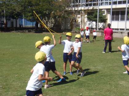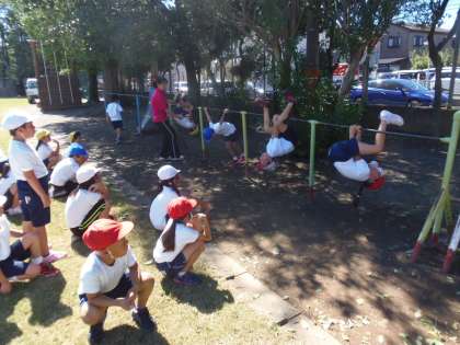 10月1日(月)2年生が体育の授業を運動場で行っていました。内容は、「長縄とび」と「鉄棒遊び」。最初に色別グループに分かれ、「長縄とび」をしました。リズムよく次々に跳ぶことができていました。その後、鉄棒の所に場所を移動し、いろいろな技に挑戦していました。順番を守り、安全に注意して行っていました。