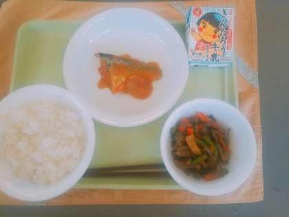 10月2日(火) 公開日 2018/10/02 更新日 2018/10/02 今日の給食 今日の献立は、ごはん、鯖の味噌煮、五目きんぴらです。鯖の味噌煮は、鯖の重さと同量の水に調味料としょうがの輪切りを入れて、煮立たせた後にさばを入れて40分煮込みました。この作り方は夏に栄養士、調理員全員で受けた研修で学び、実践してみました。さばが、ふっくらとしたまま煮込まれて、味噌のたれも良いとろみがつくように仕上がりました。 いいね(0)