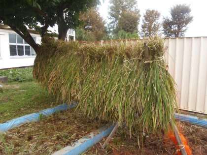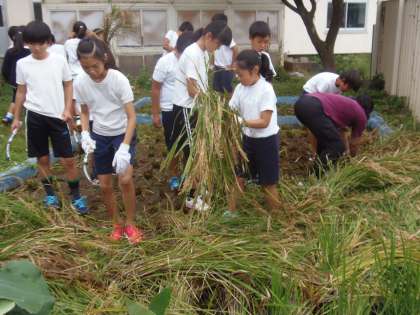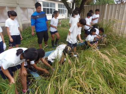10月3日(水)5校時、5年生が稲刈りを行いました。6月7日に田植えをしてから稲がしっかりと育ち、ようやく実りの秋を迎えました。稲穂が重すぎたので台風前に倒れてしまいましたが、子どもたちは稲を起こしながら鎌で刈り取りました。刈った稲は大きな束にして、竹に干しました。たくさん刈り取った稲を前に、子どもたちはとても満足そうでした。