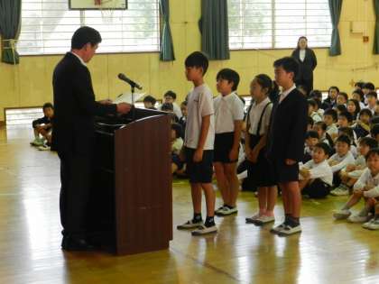 科学展の表彰 公開日 2018/10/05 更新日 2018/10/05 できごと 10月5日(金)朝、夏休みの課題の一つである小田原市科学展覧会に出品され、入賞した子どもたちへの表彰を行いました。表彰された子どもたちは、やや緊張した表情ながら、うれしそうに賞状を受け取り、全校のみんなからたくさんの拍手をもらっていました。おめでとうございます。 いいね(0)