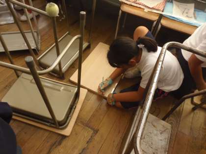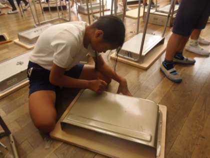 10月17日(水)3校時目、5年生が「木づかいプロジェクト」の一環として、教室の机の天板を新しく取り替える作業を行いました。農政課の方やに講師になっていただき、説明をお聞きした後に作業をしました。小田原市の間伐材で作った天板は、見た目が新しく、とてもいい香りがします。新しい天板の机は6年生になっても使用する予定です。