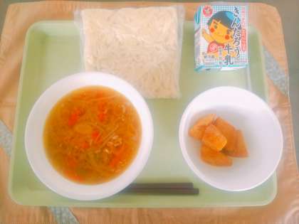 今日の献立は、にくみそうどん、牛乳、きなこポテトです。にくみそうどんは、かつおだしにしょうが、にんじん、豚肉を炒めて入れて最後にもやし、ながねぎを入れました。気温が低かったので暖まり、みそのうまみがホッとしました。きなこポテトは、じゃがいもを素揚げしたところに、砂糖、きなこを加熱してまぶしました。きなこ餅のじゃがいもバージョンです。もう少し甘みがあると良かったという感想でしたが、おおむね好評でした。