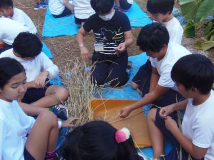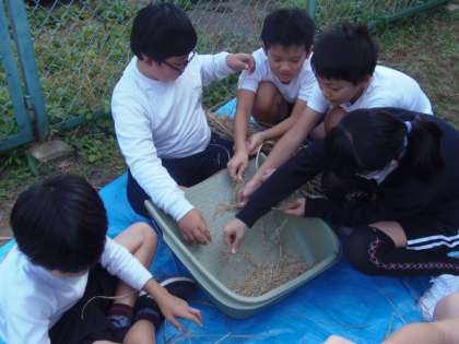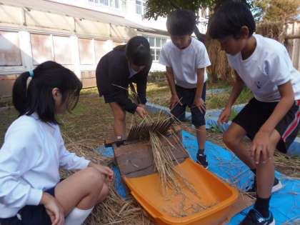 10月25日(木)5校時目、5年生が育てた稲の脱穀作業を行いました。江戸時代から使われていた「千歯扱き」を利用したり、手作業でお米とわらを分けたりしました。「唐箕(とうみ)」も用意しましたが、思うように動かず、断念しました。短い時間の脱穀作業でしたが、農作業の大変さを実感することができたようです。