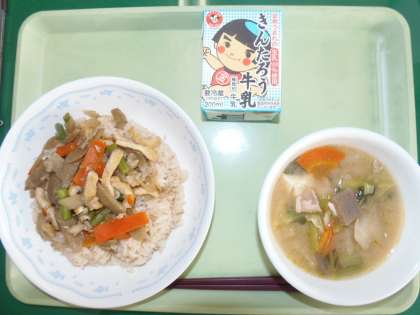 今日の献立は、とりごぼうごはん、牛乳、ちゃんこ汁です。ちゃんこ汁は、名前のとおり「ちゃんこ鍋」のように具だくさんの汁です。5種類の野菜、豆腐、豚肉からうまみのだしが出ています。かつおだしをじっくりとって、味噌は甘口と白味噌の2種類を使用しています。野菜は火を通すと見た目の量が減り、たくさん摂取することができます。今日のちゃんこ汁も野菜がたっぷりで栄養満点でした。