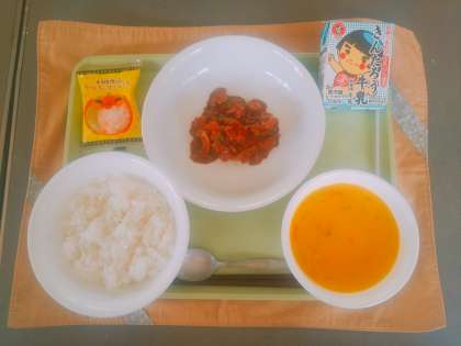 今日の献立は、ごはん、牛乳、ハンバーグきのこソース、パンプキンスープ、かぼちゃクリームもちです。今日はハロウィンなので、給食もハロウィンメニューになっています。ハンバーグのソースは、デミグラスソースにきのこを入れました。パンプキンスープはホワイトルウを手作りし、シチューのように仕上げたところにサイコロ状のかぼちゃをたくさん入れて、今日は見た目にも豪華な給食となりました。デザートのかぼちゃクリームもちは、新登場です。