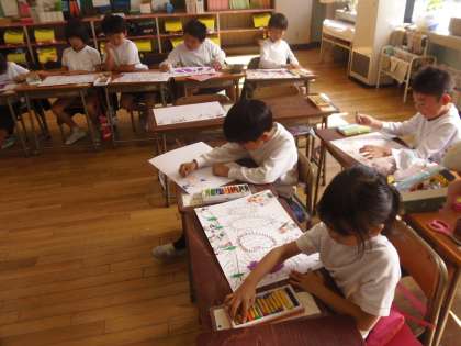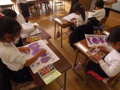 11月2日(金)授業の様子を参観しました。チャレンジ級では、11月10日(土)のふれあいバザールの時に出すお店について話し合っていました。どんな品物をいくらにして売るのか等、真剣に話し合いました。どんなお店になるのか楽しみですね。また、1年生の教室を訪問すると、図工の時間でした。先日収穫したサツマイモを描いていました。一生懸命掘った経験が絵の中にいっぱい入っており、とてもすばらしいできばえになりそうです。こちらも楽しみですね。