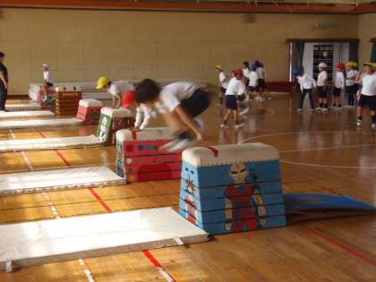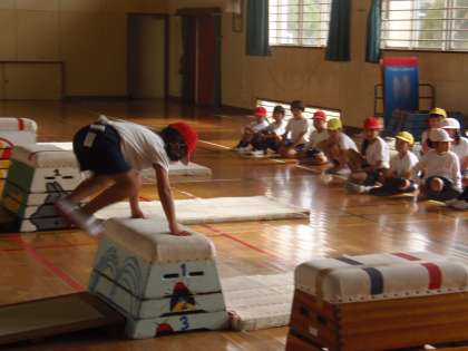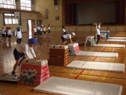 11月5日(月)3校時目、2年生は屋内運動場で体育「とびばこあそび」に挑戦していました。開脚跳びの他、抱え込み跳びや横跳びに挑戦している子もいました。技の手本をみんなで見合いながら、どのように跳んだらいいのか、うまく跳べるのかを教え合い、考えながら繰り返し挑戦していました。