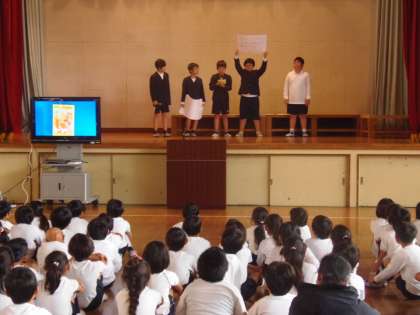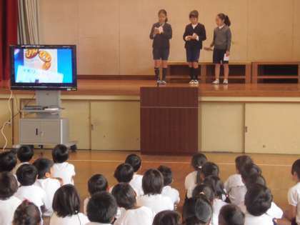 11月7日(水)朝、図書集会が開かれました。図書月間にちなんで、図書委員会から本を読む効果や、新しい本の紹介、クイズ、お知らせがありました。子どもたちは真剣にお話を聞いたり、楽しくクイズに参加したりしていました。今後は一人一人が本の紹介カードを書いたり、しおりコンクールに挑戦したりします。読書の秋をみんなで楽しみましょう。