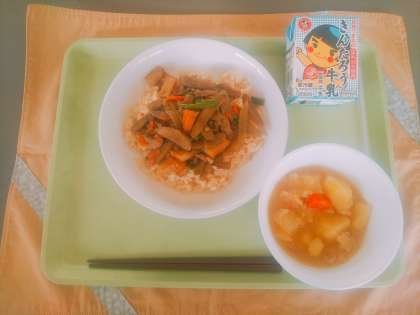 11月7日(水) 公開日 2018/11/07 更新日 2018/11/07 今日の給食 今日の献立は、きんぴらどん、牛乳、じゃがいもと鶏肉のみそ煮です。きんぴらどんは、豚肉、にんじん、つきこんにゃく、ごぼう、さつまあげを細切りして、だしと調味料で炒め煮しました。きんぴらをご飯の上にかけて丼として食べます。茶飯の上にかけて食べたので、しっかりと味がついてよく食べてくれました。じゃがいもと鶏肉のみそ煮も人気で、今日の残りはほとんどありませんでした。 いいね(0)