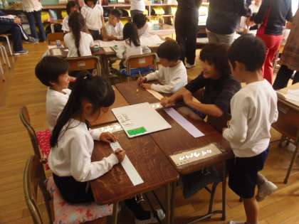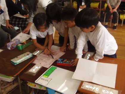 11月7日(水)校内研究の授業公開が行われました。今回は1年生による生活科「あきとあそぼう」の授業で、収穫したサツマイモのツルをリースとして販売することになりました。そのために必要な準備について、グループに分かれて一生懸命話し合い、準備を進めようと努力していました。さて、どんなお店になるのでしょうか。11月10日(土)のバザールをお楽しみに!