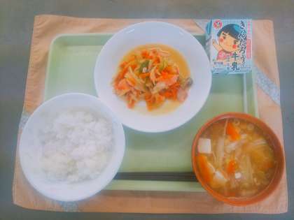 今日の献立は、ごはん、牛乳、鮭のチャンチャン焼き、白菜のそぼろ汁です。鮭のチャンチャン焼きは北海道の郷土料理です。作り方は、鉄板の上に野菜をしいて、その上に鮭をのせ、その上にさらに野菜を入れ鮭を蒸し焼き状態にして火を通します。最後にバターが入ったみそだれをかけて、タレと一緒に豪快に混ぜて食べます。本場の作り方に近づけるために、今日は角切りにした鮭を1度焼いて、その上にみそだれをかけて、野菜と混ぜて食べてもらいました。残りはほとんどなく、よく食べてくれました。