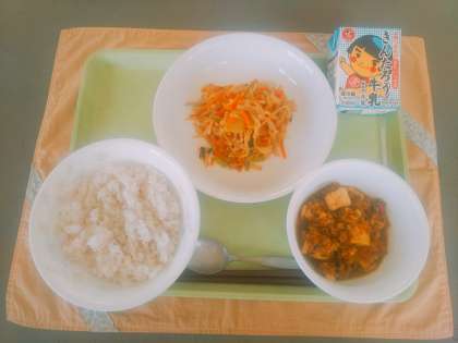 11月20(火) 公開日 2018/11/20 更新日 2018/11/20 今日の給食 今日の献立は、麦ご飯、牛乳、マーボー豆腐、切り干し大根のナムルです。切り干し大根は、煮物にすることが多いですがナムルにしても美味しくできます。給食は、加熱調理が基本なので、切り干し大根をさっとゆでて、にんじん、もやし、小松菜と一緒に炒めます。調味料はしょうゆ、酢、砂糖のみです。あっさりとしていて、マーボー豆腐によく合いました。 いいね(0)