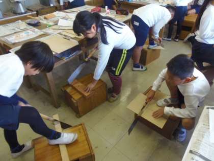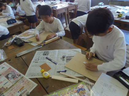 11月30日(金)3〜4校時、4年生が図工「ギコギコクリエーター」に取り組んでいました。「ギコギコ」ですから、のこぎりを使って木を切り、自分が欲しいものを作ります。最初に、教室でのこぎりの使い方等を学んだ後、図工室へ移動し、作業を行いました。作りたいものの形を描くと、あちこちからギコギコの音。みんな一生懸命、作品作りに取り組んでいました。
