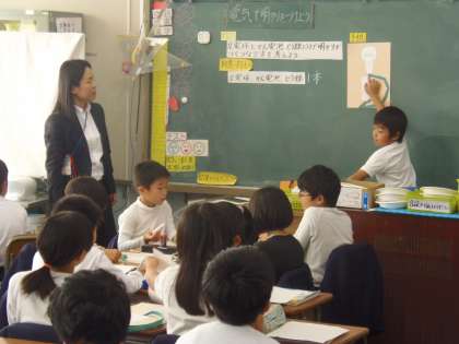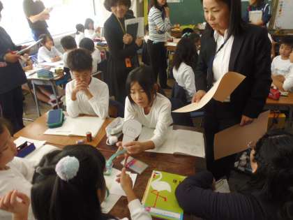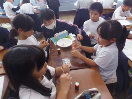 12月4日(火)4校時目、3年生の教室で校内研究授業が行われました。理科「電気で明かりをつけよう」の授業で、豆電球・乾電池・導線(1本)だけで明かりがつくつなぎ方を調べました。個人で予想を立て、グループで模型を使って話し合い、実験して確かめるという流れです。子どもたちは、これまで学習した「回路」の考え方をもとに、いくつかの方法を考え、予想を立て、実験に取り組みました。グループ内でのコミュニケーションを大切にしながら、一生懸命考え、楽しく実験を進めていました。