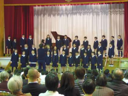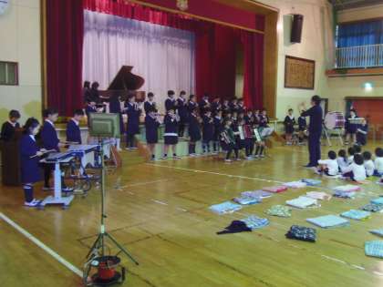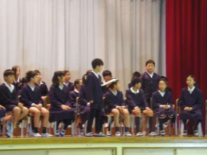 最初に5年生が発表しました。道徳の時間に学習した「手品師」の劇を行いました。授業中に話し合った様子を再現していましたが、一人一人が自分の意見を持ち、様々な視点から考えることができていて感心しました。また、合奏「生命の息吹」や合唱「COSMOS」はさすが高学年。素晴らしい演奏と歌声でした。