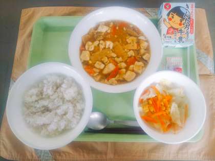 今日の献立は、麦ご飯、牛乳、四川豆腐、温野菜です。四川豆腐は、中国四川省の料理です。麻婆豆腐より赤く仕上げました。本場の味は、豆板醤、ラー油、山椒が入りますが、給食では赤味噌、コチジャン、豆板醤を使用しました。具材は、たけのこ、干ししいたけ、にんじん、ひき肉が入ります。豆腐は、豆製品として良質なたんぱく質を摂取できるので、豆腐料理の1品としておすすめです。