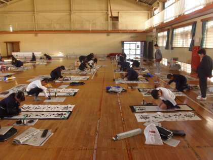 12月14日(金)5・6年生が書き初めの練習をしました。5年生は「進む勇気」、6年生は「新たな決意」と書きました。原寸大のお手本を見て、字の大きさや形を確認しながら、ていねいに書き進めていました。新聞紙に書く練習後、条幅紙に書く時には緊張感を持って書いていました。お手伝いいただきましたボランティアの皆様、ありがとうございました。