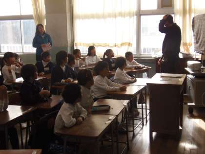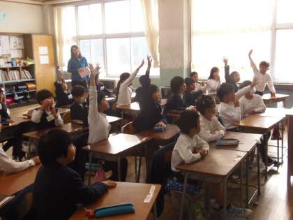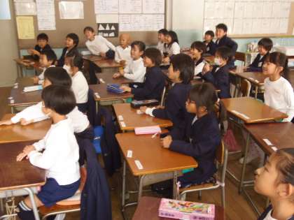 12月17日(月)2校時目、2年生の教室ではALTのマシュー先生による英語の授業が行われていました。グループ対抗のクイズ形式で楽しく授業が進んでいました。体の部分や数、動物の名前などを英語で正しく答えられると点数が入るというルールです。子どもたちは積極的に発表したり、マシュー先生に続いて発音したりして、英語に親しむことができていました。
