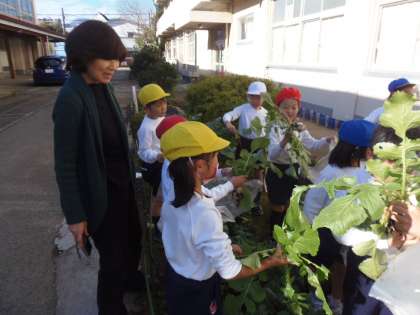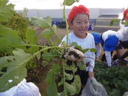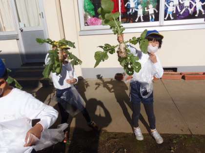 大根の収穫(1年) 公開日 2018/12/19 更新日 2018/12/19 できごと 12月19日(水)2校時目、1年生が大根の収穫をしました。葉っぱについた虫取りをしっかり行ったおかげで、葉っぱも無事収穫することができました。一般に売られている大根とは違い、10センチメートルほどの小さな大根ですが、子どもたちの「大きく育て」の気持ちがこもった大根です。家に持ち帰りましたら、一緒に美味しく調理してお召し上がりください。 いいね(0)