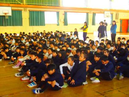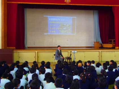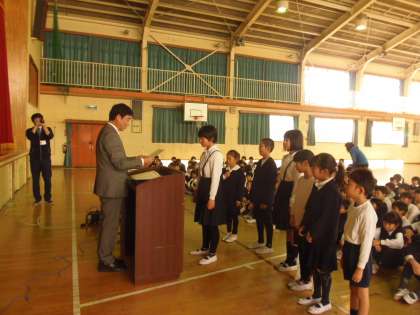 後半は、校長から、1;市制記念日クイズ、2;冬休みに気をつけることのお話をしました。冬休みに気をつけることは、「交誘挨手火(こうゆうあいてか)」(交通事故、誘拐事件、挨拶、手伝い、火遊び)として覚えてもらいました。特に、交通事故や誘拐事件に巻き込まれないよう、また、火遊びは絶対にしないように伝えました。