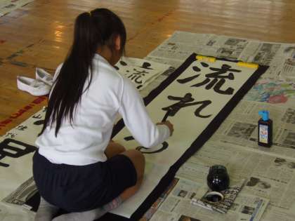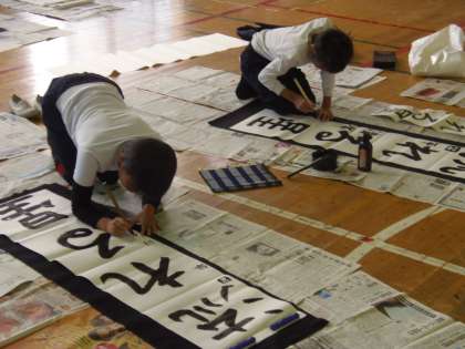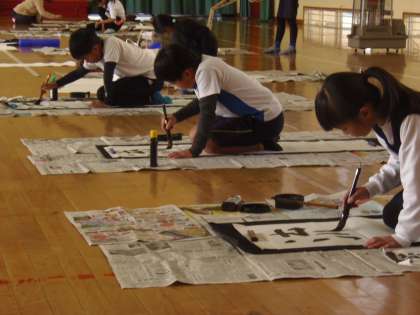 書き初め会(4年) 公開日 2019/01/10 更新日 2019/01/10 できごと 1月10日(木)3〜4校時目、4年生の書き初め会が行われました。朝、書き初めの道具を抱えて登校していましたが、みんなやる気に満ちていました。清書が始まると、とても静かに気持ちを整え、黙々と書き進めていました。名前まで書き終えると、ほっとした表情に戻っていました。みんなとても頑張りました。 いいね(0)