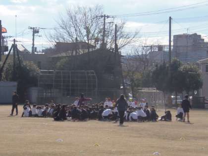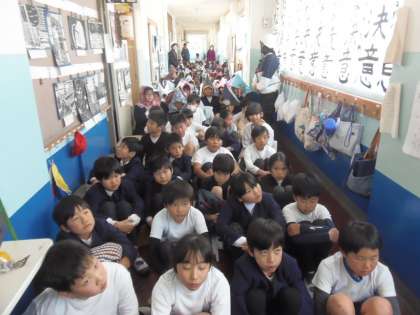 1月10日(木)昼休み、予告なしの避難訓練を実施しました。今回は、大きな地震の後に津波が発生するという想定で、校舎3階に避難しました。地震時に運動場で遊んでいた子どもたちは、地震発生の放送と同時に運動場の中央部に集まり、自分の身を守る行動をとりました。次に、津波警報発令の放送があり、校舎3階の学年毎に決められた場所に避難しました。想定では、大地震発生5分後に10メートルの津波が押し寄せると言われており、安全で速やかな行動が必要です。避難中、子どもたちは押したり転んだりすることなく、自分の身を守る行動をとることができました。