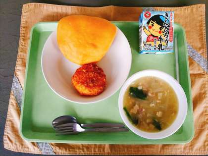 今日の献立は、サンドパン、牛乳、チーズフォンデュサンドコロッケ、だいこんとベーコンのスープです。チーズフォンデュコロッケは、コロッケの中にとろっとしたチーズが入っています。油で揚げるときにチーズが出てきてしまうことが多いですが、調理員さんがきれいに揚げてくれました。パンにはさんで食べます。だいこんとベーコンのスープは、コンソメ味のスープにだいこんがたくさん入っています。きのこ、鶏肉なども入っていて栄養たっぷりです。