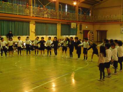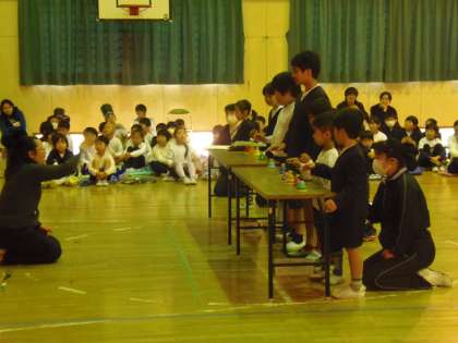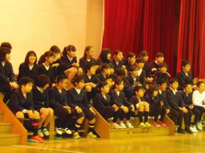 2番目の出し物は、1年生が行いました。内容は、歌とダンスです。「1年生の1は…」と歌った歌は、とてもかわいらしく、6年生はじっとにこやかに見つめていました。入学時からずっとなかよく過ごしてきた1年生の感謝の気持ちが届いたことでしょう。次の、チャレンジ級の出し物は、「ビリーブ」の歌のハンドベルによる演奏でした。その曲に合わせて、6年生は手話をし、なつかしく思い出しながら歌っていました。