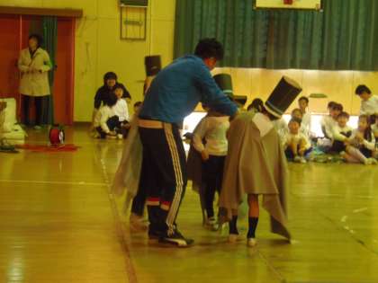 2年生の出し物が始まる前、6年生担任の神谷先生が連れ去られました。「返して欲しければ縄跳びの挑戦を受けよ」と。2年生と6年生の縄跳び対決が始まりました。2重跳びなど、2年生は6年生に迫っていましたが、最終的には2勝2敗の引き分けに終わりました。4年生はとても楽しい劇を演じ、6年生から明るい笑いを引き出していました。また、先生たちからは「栄光の架け橋」の歌のプレゼントもありました。