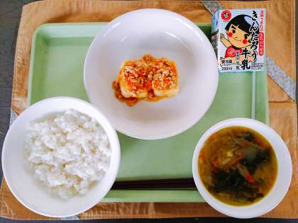 2月26日(火) 公開日 2019/02/27 更新日 2019/02/27 今日の給食 今日の献立は、ごはん、牛乳、あげだしとうふのそぼろあん、わかめスープです。あげだしとうふは初めての登場でした。木綿豆腐を人数分にすべて切り分け(1人2個づけです)重しを乗せて水を切り、片栗粉と小麦粉をつけて揚げました。そぼろあんは鶏ひき肉で作り、片栗粉の量を調整しました。そぼろあんとよく絡んで、とても美味しくできました。初めて食べる子もいたようですが、子どもにも人気でした。 いいね(0)
