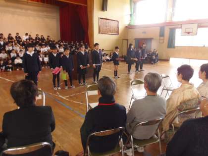 2月27日(水)朝、「感謝の会」を開きました。感謝の会は、この1年間、スクールボランティアでお世話になった方々をお呼びし。子どもたちが書いた感謝の手紙や歌のプレゼントをお渡しし、感謝の気持ちをお伝えする会です。「芝生」「読み聞かせ」「児童見守り隊」「交通安全母の会」「茶道クラブ」「ミシン」「書道」「シルバー大学60+α」「バザールのお手伝い」「池と花の会」「スクールボランティアコーディネーター」約30名ほどの皆様にお越しいただきました。今後とも、新玉小学校の教育にお力添えいただきますよう、よろしくお願いいたします。