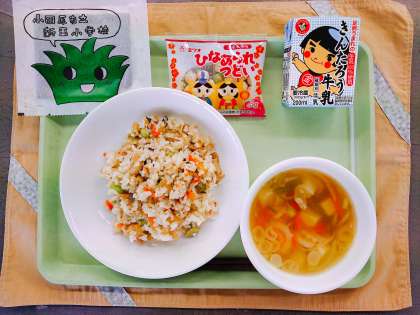 今日の献立は、ごもくずし、牛乳、てまきのり、すましじる、ひなあられです。昨日3日がひなまつりだったので、今日はひなまつり献立でした。てまきのりは、給食週間の取り組みで募集した「のりのパッケージイラスト募集」でグランプリに輝いたイラストがプリントされています。募集をしてオリジナルイラストにしたのは初めての試みだったので、出る日を楽しみにしていた子も多いようです。しばちゃんのキャラクターと、新玉小学校の名前が入っていてすてきでした。