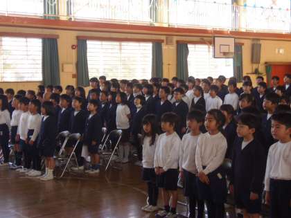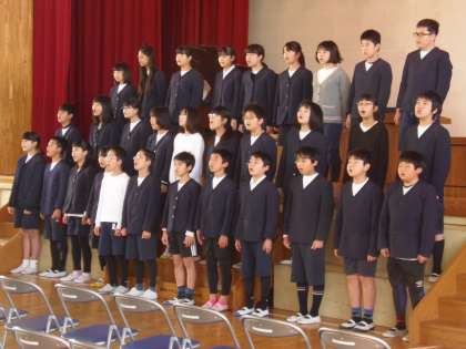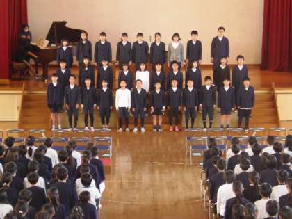 3月5日(火)朝から1校時目にかけは、式歌練習の時間でした。先日、体育館には卒業式本番と同じように、5年生によって椅子が並べられました。今日の練習では、最初に席の確認から始まりました。そして、1〜5年生が歌う「未来への賛歌」の練習が始まりました。各学年で練習してきているので、声はよく出ていましたが、練習の中でさらに美しい声になりました。6年生も加わり、「旅立ちの日に」「校歌」「国歌」の練習もしました。最後に、座り方や礼の仕方等、礼法指導もありました。卒業式に向け、練習も本格化しています。