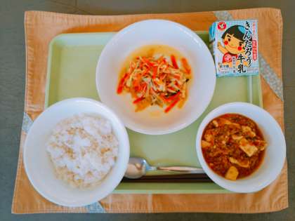 今日の献立は、麦ご飯、牛乳、マーボーとうふ、きりぼしだいこんのナムルです。新玉小学校のマーボーとうふは、校内で保護者の方とお会いしたときに「作り方を教えて下さい」とお声をかけていただくメニューのひとつです。いくつか新玉流のこだわりがあります。長ねぎは最初に炒める用と最後に入れる用とに分けておき、最初に炒める長ねぎはよーく炒めます。豆板醤も最初と最後に入れます。味噌は赤味噌と八丁味噌の2種類をブレンドしています。調味料を入れてからよく煮込むこともポイントです。