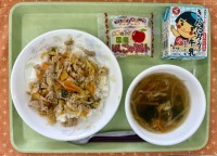 今日の献立は、やさいあんかけラーメン、牛乳、チキンチキンごぼうです。チキンチキンごぼうとは、ごぼうを斜め切りにして片栗粉をつけて油で揚げ、鶏肉も片栗粉をつけて揚げます。じゃがいもは素揚げをして、砂糖、しょうゆ、みりんのタレに絡めます。じゃがいも、ごぼう、鶏肉の味が合わさってとても美味しいです。やさいあんかけラーメンは、餡を麺によく絡めて食べてもらいました。