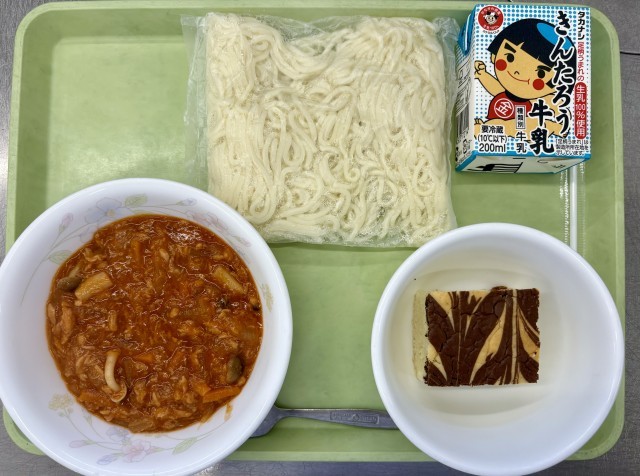 * 牛乳 ソフト麺ツナのトマトソース マーブルケーキ *