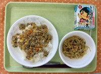 今日の給食は、6月15日に開校110周年を迎える新玉小学校のお祝い献立です。主食はおめでたい日に食べる赤飯でした。あまり食べ慣れていない赤飯は好みが分かれてしまいましたが、今日の給食を通して「祝い事で赤飯を食べる」と言うこと知ってもらえたら嬉しいです。お祝い汁は華やかな見た目になるように、花型の人参と大根,梅なるとを具材に入れました。デザートのシューアイスは、みんなとても楽しみにしていたようで大喜びでした。