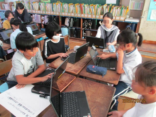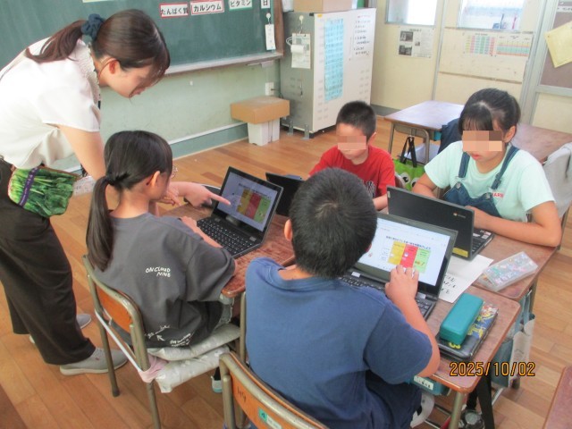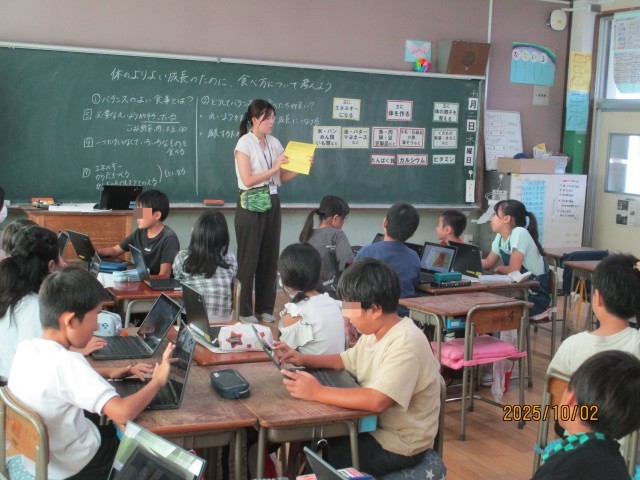 栄養士の大林先生から食についてのお話を聞きました。今回は、保健の学習で行った、体の発育・発達に必要な生活の仕方の中の「食事」についてのお話でした。体を発育・発達させるためには、バランスのとれた食事が必要なことを知り、バランスよく食べたほうが良い理由を話し合ったり、自分の給食の食べ方を振り返ったりしました。子供たちは、「お肉だけでなく、野菜やごはんもバランスよく食べるようにしたい。」「元気な体を作るために苦手なものも少しずつ食べるようにしたい。」と、自分のよりよい食生活に向けた目標を立てることができました。