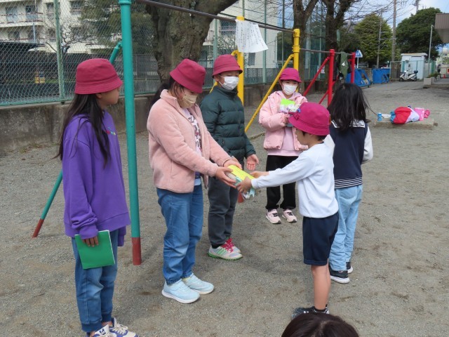 2月の終わりに全校での6年生を送る会がありましたが、あしがら級でも10日(火)の3時間目に6年生を送る会を行いました。事前に6年生がみんなで最後にやりたい遊びについて話し合い、おにごっことパラシュートをして遊びました。送る会の終わりには、6年生から教室名の札とぞうきんのプレゼントがあり、在校生からは一人ひとりがリボンで作ったお花を受け取りました。短い時間でしたが、たくさんの笑顔が見られた心温まるひとときでした。