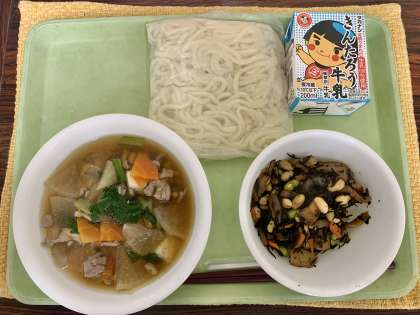 今日は節分献立として豆を使った煮物と、こんにゃく入りのけんちん汁を出しました。
