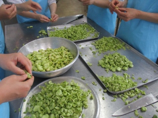 そして、この後さらに豆の薄皮を一つ一つ調理員さんにむいてもらい、無事に給食の「そら豆入りソテー」に入れることができました。