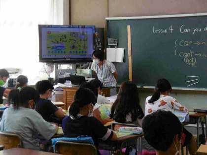 5年生の教室で英語専科の先生が中心となった学習を行っていました。先生のテンポのよい英語に子どもたちが楽しそうに反応しています。