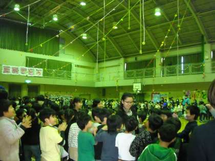 スマイルミュージック委員会による全校合唱「パプリカ〜送る会バージョン〜」をみんなで中央に集まり、仲よく合唱しました。