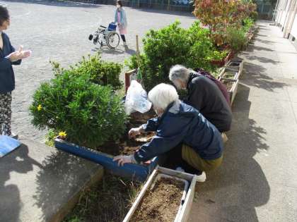 学校の職員室前に「潤生園」と書かれた花壇があります。先週の金曜日、この花壇にたくさんの花が登場しました。実は地域にある「みんなの家はくさん」のみなさんが学校に来て花苗を植えてくださったのです。パンジーやゼラニウム、ウモウケイトウなどが色とりどりに並び、とてもきれいになりました。地域との温かいつながりです。