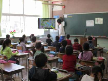 1年生の教室で、さっそく算数の勉強が始まりました。教科書の絵をみて、まずは仲間分けをし、そのあと数を数えていきます。
