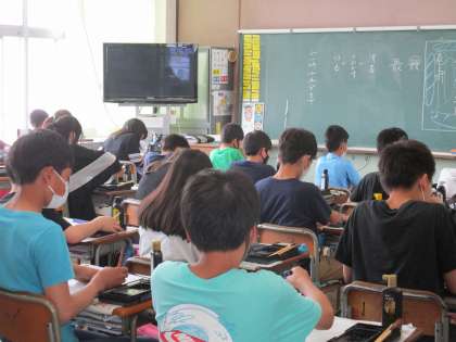 6年生の教室がものすごく静かです。書写(毛筆)の時間でした。「さみだれを あつめて早し 最上川」の俳句を半紙に3行にして書いていました。用紙に対してどのような大きさで書いたらよいかを考えて書くことがめあてです。